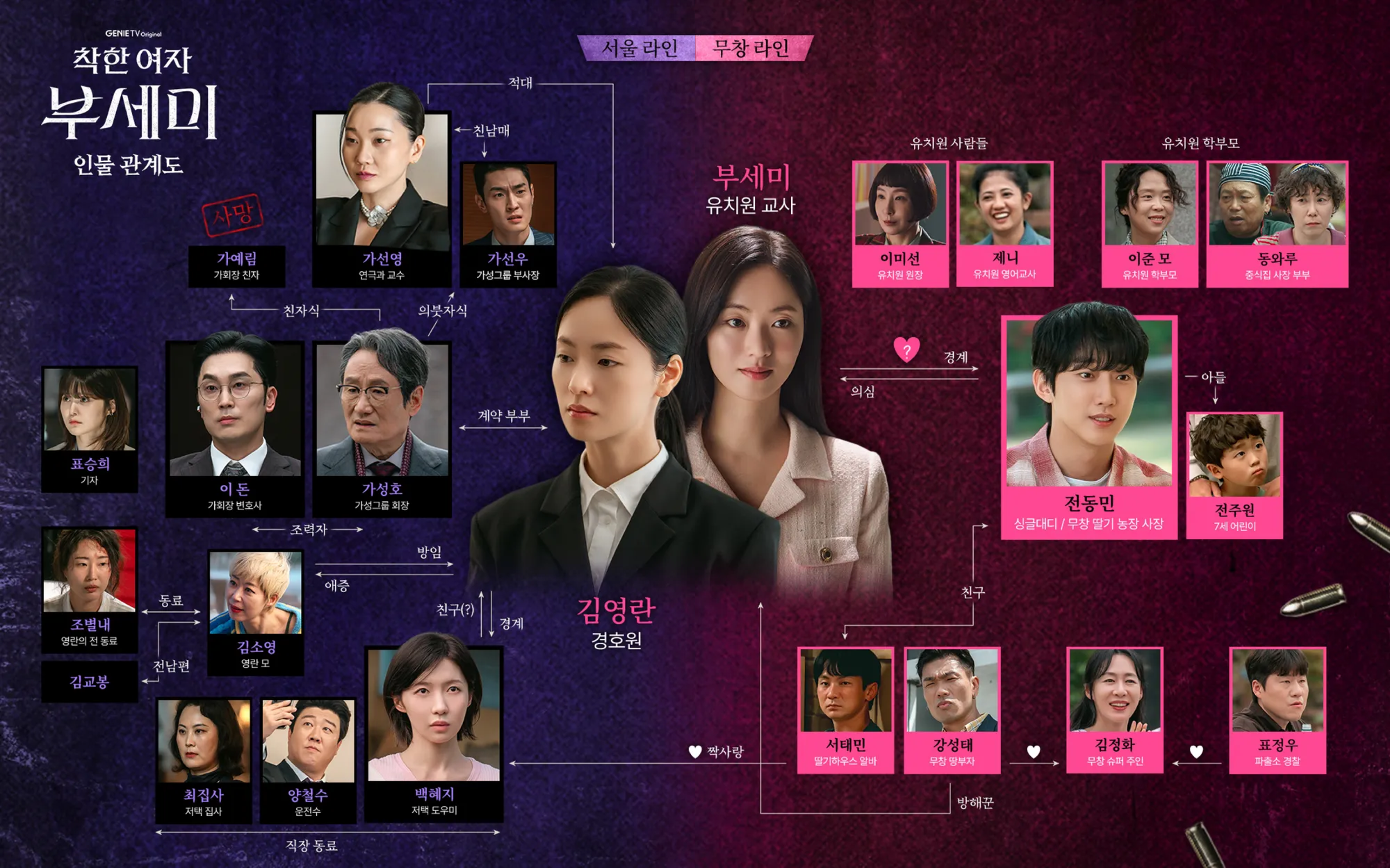 - 김영란 / 부세미(전여빈) – 흙수저 경호원 출신, 인생 한 방을 노리고 시한부 재벌 회장과 계약 결혼을 감행. 가짜 신분 ‘부세미’로 3개월간 살아남아야한다.