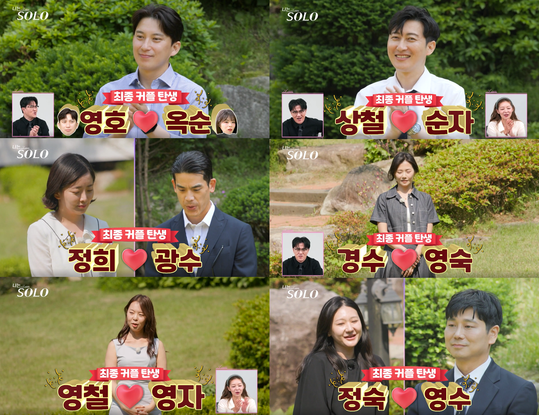 - 나머지 세 커플(영철-영자, 광수-정희, 영호-옥순)은 현실적인 고민들과 작은 사건들을 쌓아가며 안정적인 관계를 완성했습니다. 각자의 고유한 캐릭터와 방식, 그리고 의사 전달의 과정에서 진짜 사랑의 힘이 드러납니다.