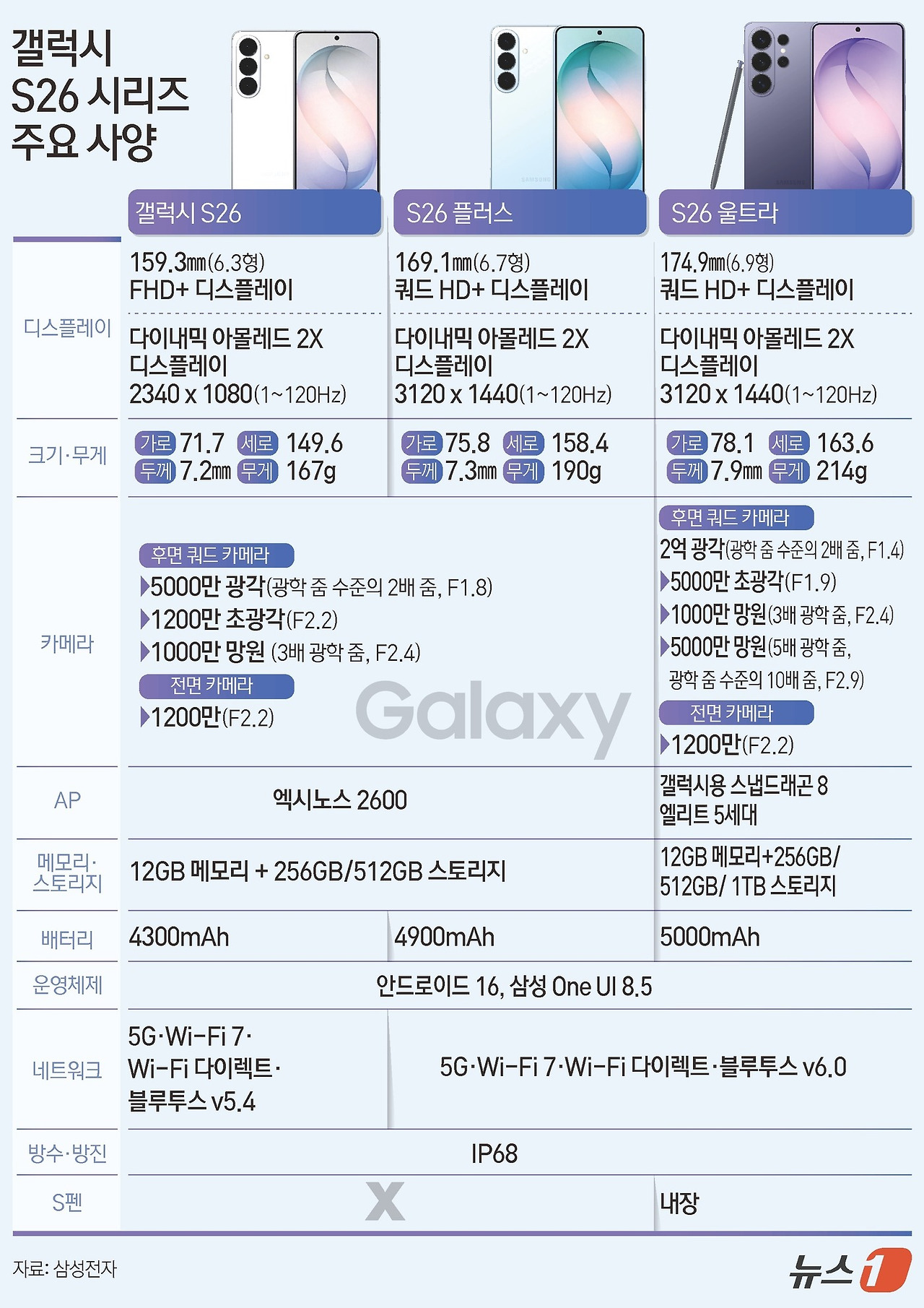 - 출시: 2026년 3월 11일 글로벌 출시, S26 시리즈의 기본형 모델